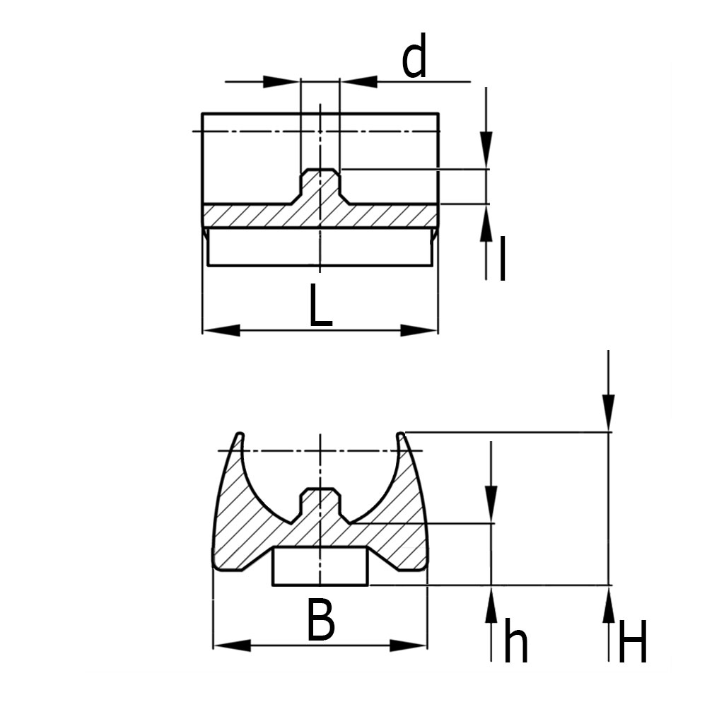 B=Largeur pied, Dimension du tube=Ø-tube extérieur, D=Ø-tige, H=Hauteur, h=Hauteur (inclus. épaisseur de feutre), l=Longueur de tige, L=Longeur pied