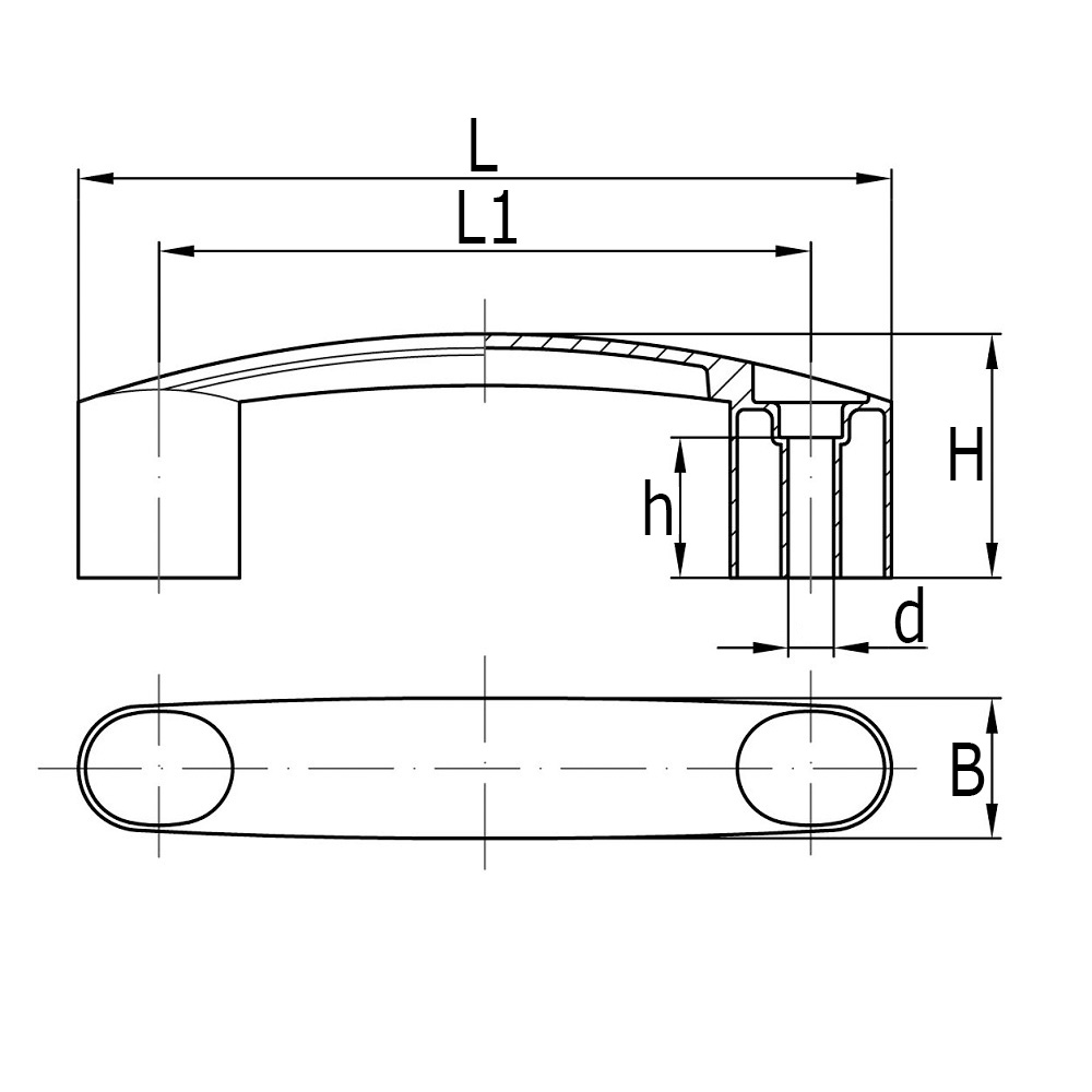 B=Largeur, Perçage =Ø-perçage, H=Hauteur, h=Hauteur, L=Longeur totale, L1=Dimension perçages entraxe +/-1mm, Exécution=Exécution pour cache décoratif