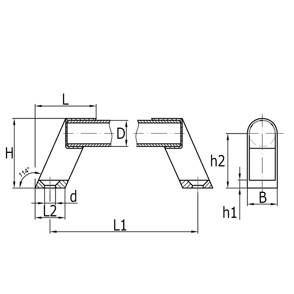 B=Largeur, D=Ø-tube, d=Ø-perçage, H=Hauteur, h1=Hauteur, h2=Hauteur, L=Longueur de pièce d'extrémité, L1=Distance entre axes des perçages +/-1mm, L2=Longueur
