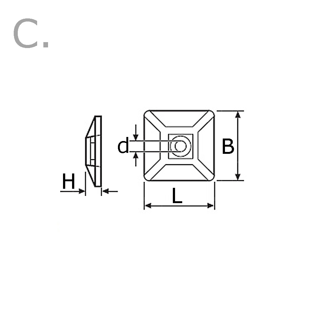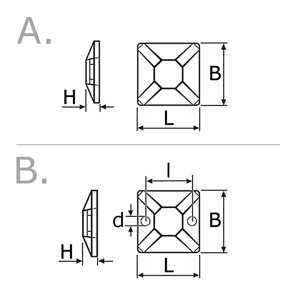 - Les embases pour colliers de serrage auto-adhésives sont disponibles dans des dimensions allant de 13x13 mm à 40x40 mm