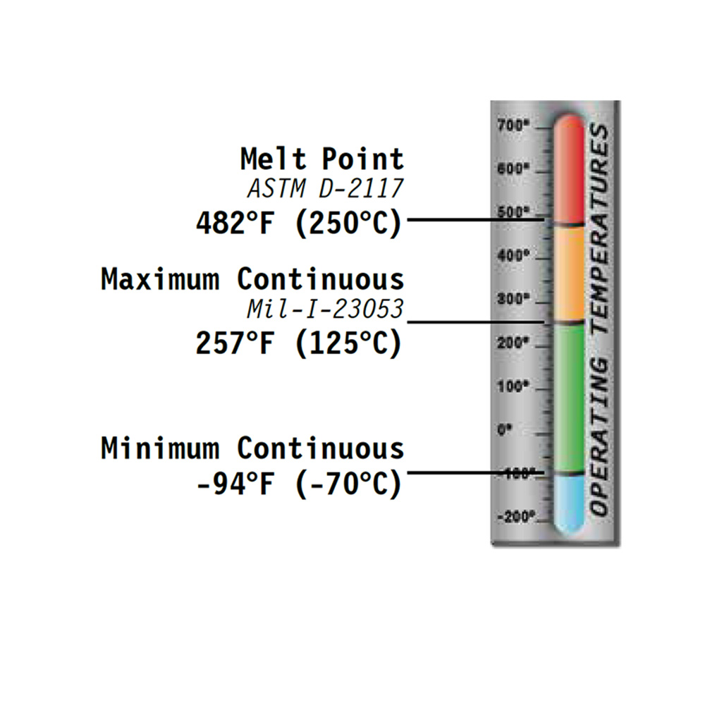 - Résistance à la température: -70˚C à +125˚C (charge continue), température de fusion +250˚C