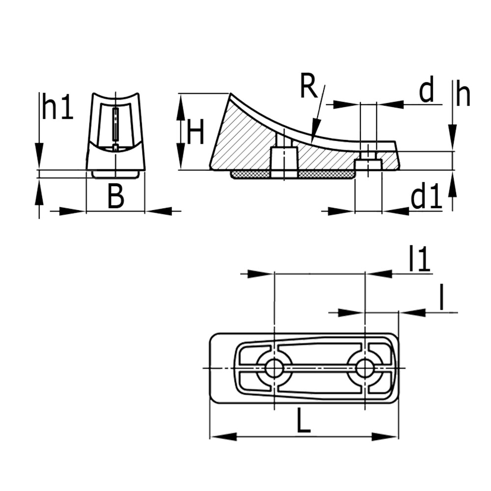 B=Largeur, Dimension du tube=Ø-tube extérieur, D=Ø-perçage, D1=Ø-fraisé, H=Hauteur, h=Hauteur, h1=Épaisseur de feutre, L=Longeur totale, l=Distance jusqu'à axe perçage, l1=Entraxe perçages, R=Rayon