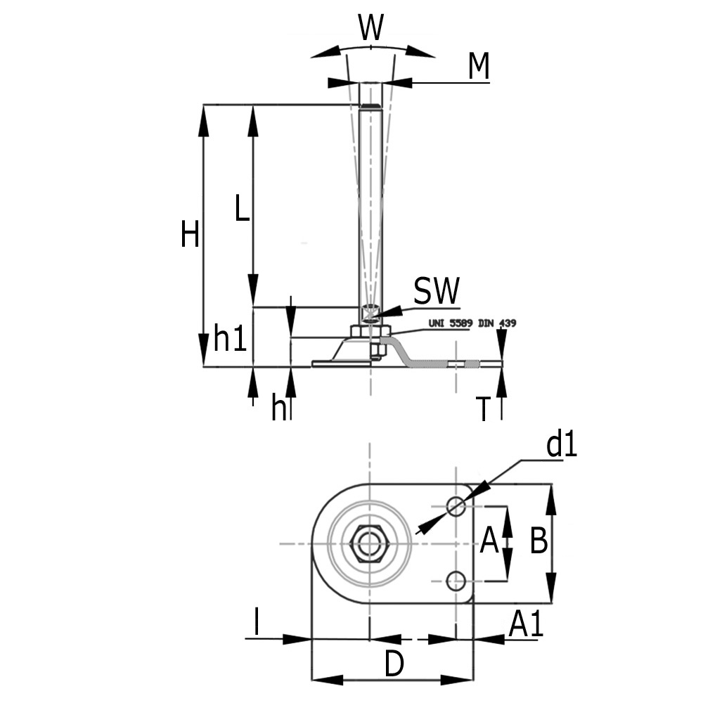 H=Hauteur de construction totale , h=Hauteur, h1=Hauteur pied, K=Charge statique maximale en kg, L=Longueur de broche, M=Dimension filetage broche, S=Épaisseur de plaque, SW=Sur plat