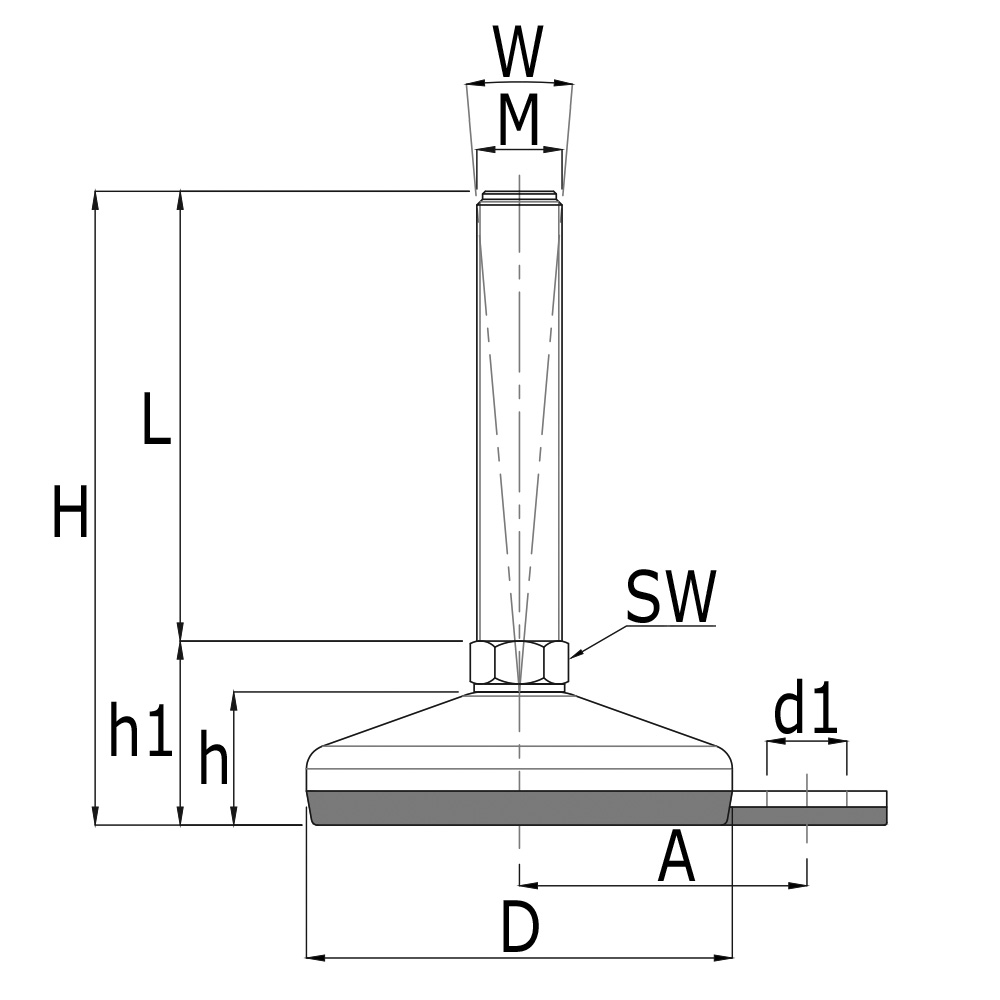 A=Afstand tot hart boring, D=Voet-Ø, d1=Boring-Ø, H=Totale bouwhoogte, h=Voethoogte, h1=Hoogte, K=Maximale statische belasting in kg, L=Draadlengte spindel, M=Schroefdraad, SW=Sleutelwijdte, W=Maximale opstelhoek in °