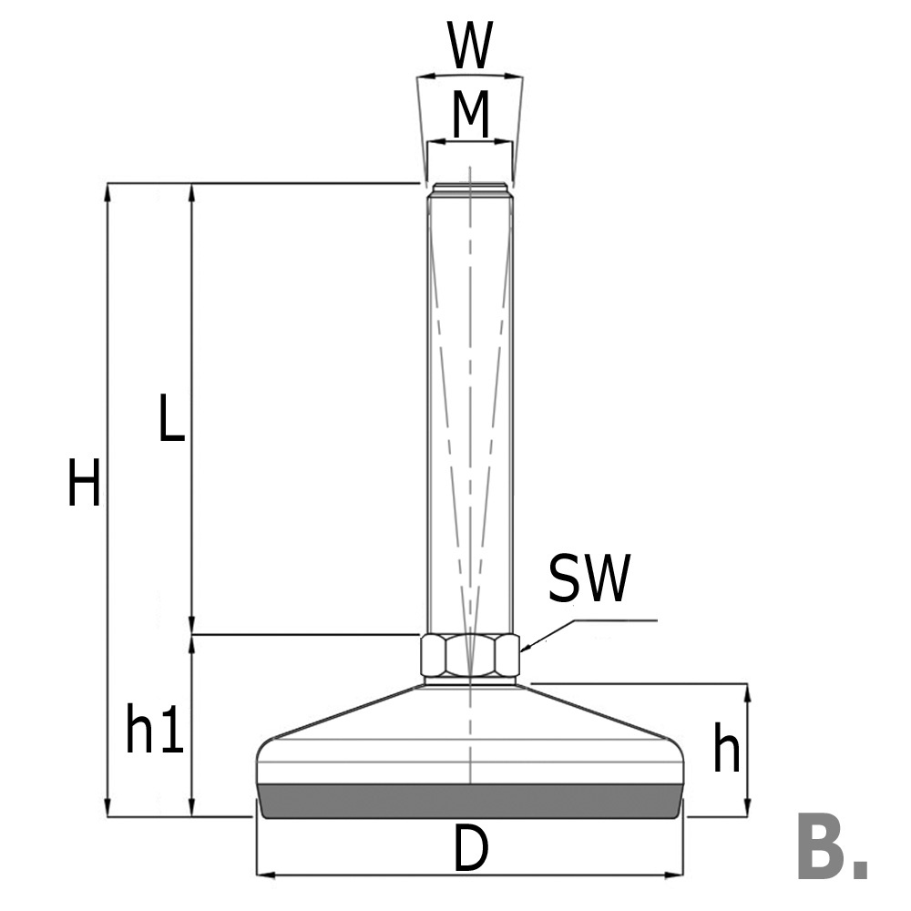 A=Distance jusqu'à axe perçage, D=Ø-pied, D1=Ø-perçage, H=Hauteur de construction totale , h=Hauteur de pied, h1=Hauteur, K=Charge statique maximale en kg, L=Longueur du filetage broche, M=Filetage, SW=Sur plat, W=Angle de montage maximale en °