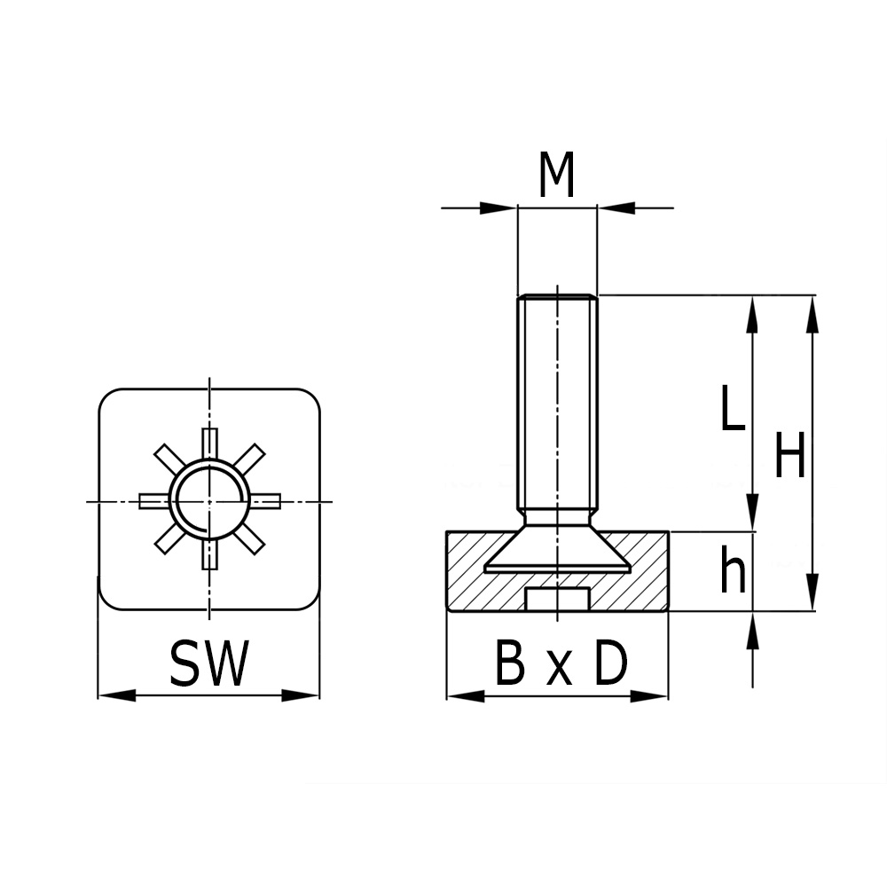 - Le pied carré injecté est disponible dans les largeurs de clé allant de SW20 à SW40