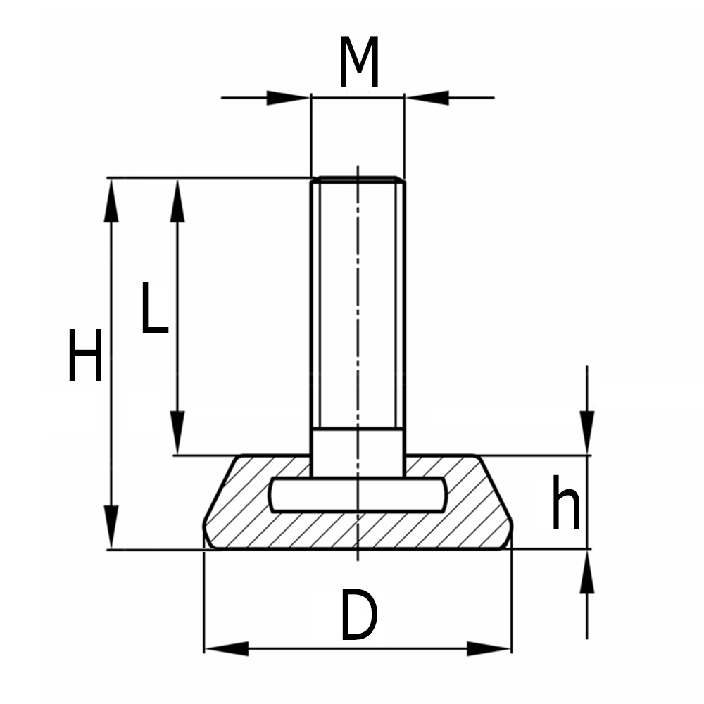 - Les pieds réglables à pied conique rond sont disponibles avec des broches filetées de M6 à M10 avec des longueurs de filets de 15 mm à 60 mm