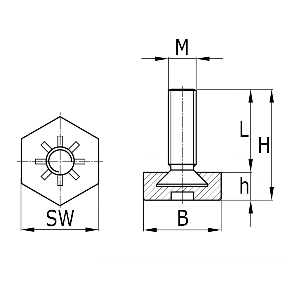 H=Hauteur pied, L=Longueur du filetage utilisable, M=Broche, SW=Sur plat