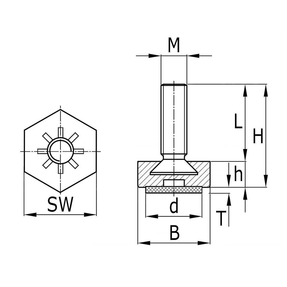 D=Ø-feutre, H=Hauteur pied, h=Épaisseur de feutre, L=Longueur du filetage utilisable, M=Dimension de boulon, SW=Sur plat