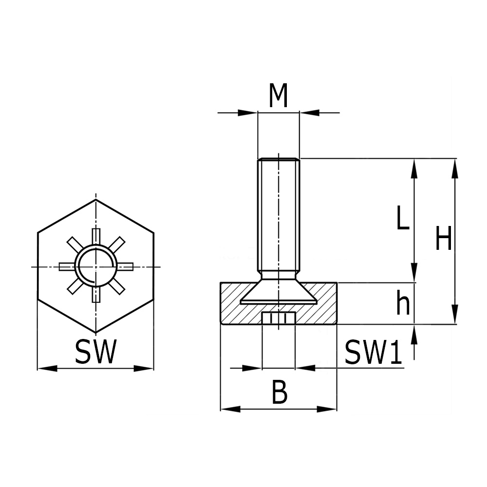 H=Hauteur pied, L=Longueur du filetage utilisable, M=Broche, SW=Sur plat, SW1=Sur plat vis à six pans creux