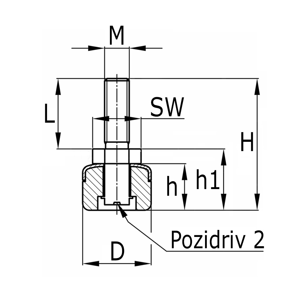 D=Ø, H=Hauteur totale , h=Hauteur pied, h1=Hauteur pied + hexagonal, L=Longueur du filetage, M=Filetage, SW=Sur plat hexagonal