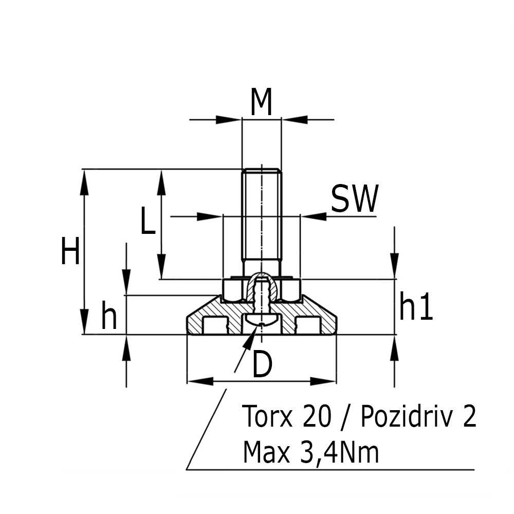 • Tête Phillips dans le pied (Pozidrive 2 / Torx T20) pour un vissage facile à la machine (couple de serrage max. 3,4 Nm)