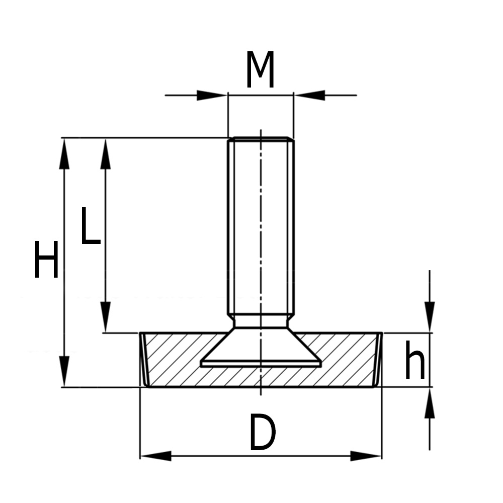 D=Ø-pied, H=Hauteur pied, L=Longueur du filetage utilisable, M=Broche