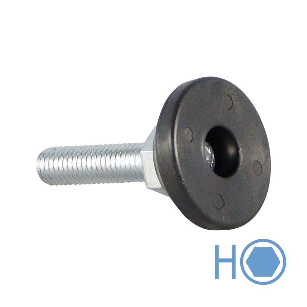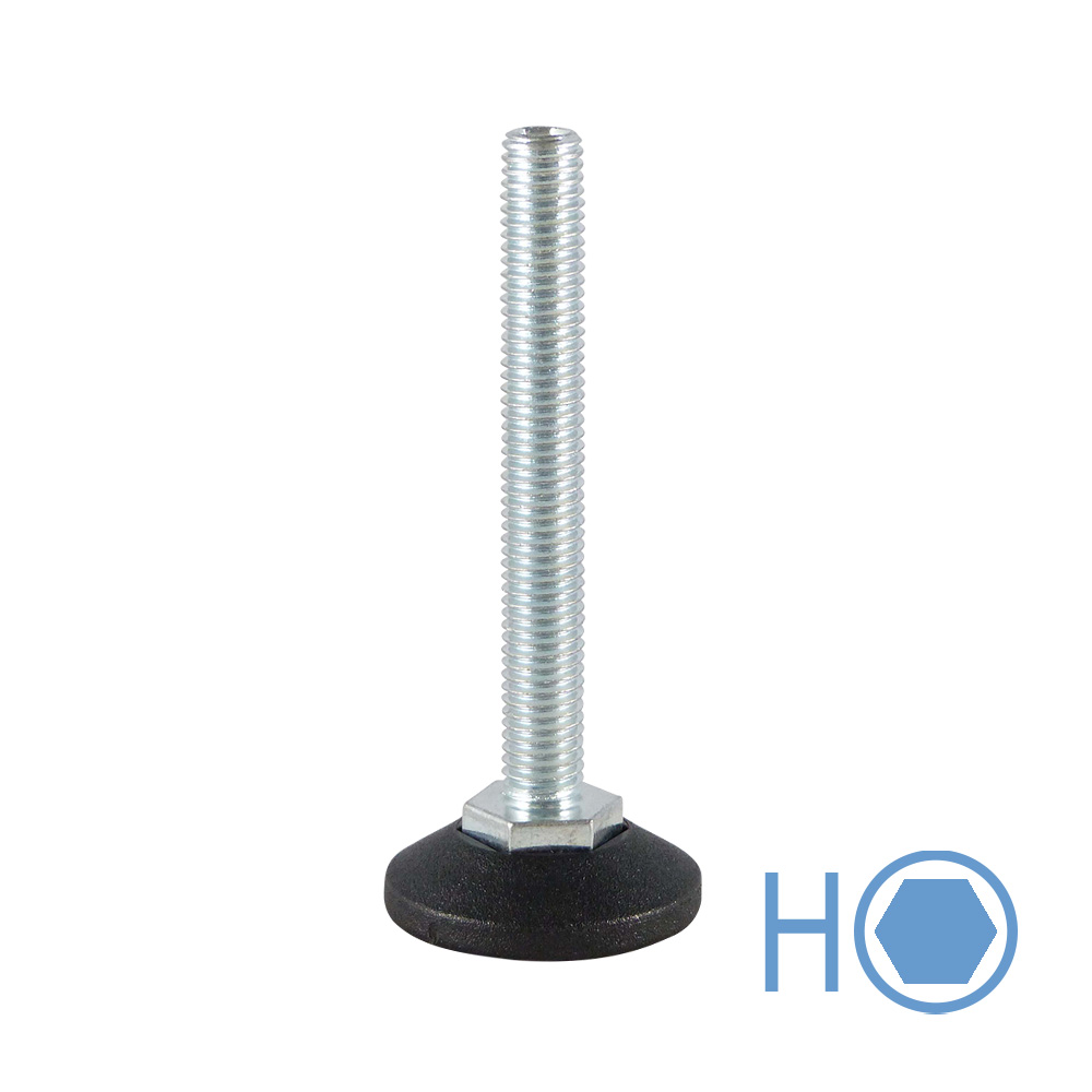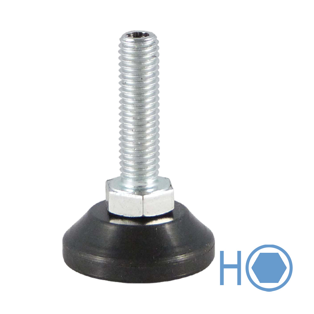 - Les pieds réglables à base plastique conique pivotante sont disponibles avec des broches filetées de M8 à M12 avec des longueurs de filetage de 30 mm à 120 mm