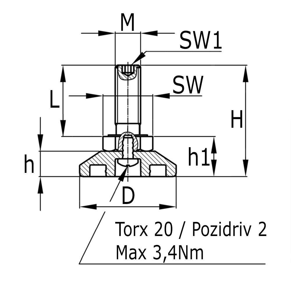 D=Ø-pied, H=Hauteur pied + hexagonal, K=Capacité de charge statique max. en kilogramme, L=Longeur broche, M=Dimension de filetage, SW=Sur plat hexagonal / six pans creux