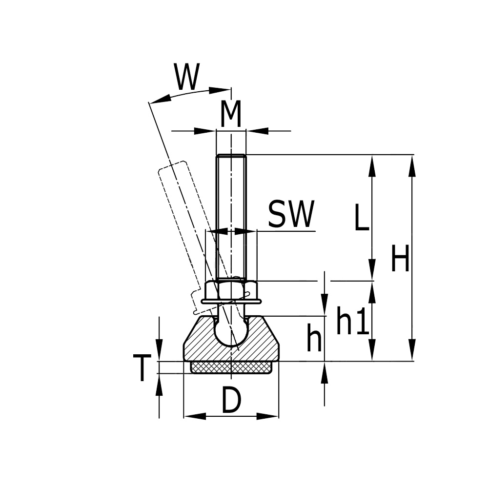 D=Voet-Ø, H=Hoogte, H1=Hoogte tot bovenkant zeskant, L=Draadlengte, M=Draad,