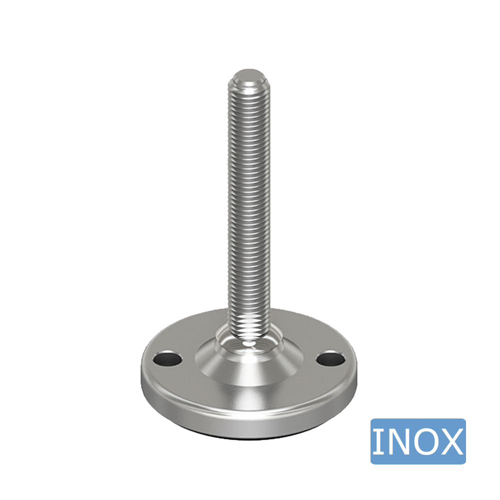 - Les pieds de mise à niveau en acier inoxydable avec base massive et trous de fixation sont disponibles avec des tiges filetées de M16 à M30 et dans des longueurs de 50 mm à 250 mm