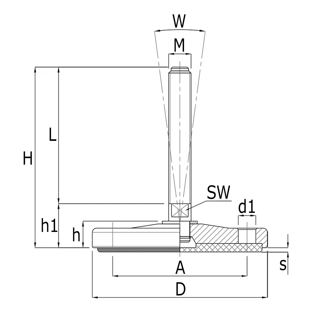 A=Distance perçages, D=Ø-pied, d1=Ø-perçage, H=Hauteur de construction totale, h=Hauteur de pied, h1=Hauteur minimale, L=Longueur du filetage broche, M=Filetage, N=Capacité de charge statique max. en newton, s=Hauteur de semelle antidérapant, SW=Sur plat, W=Angle en °