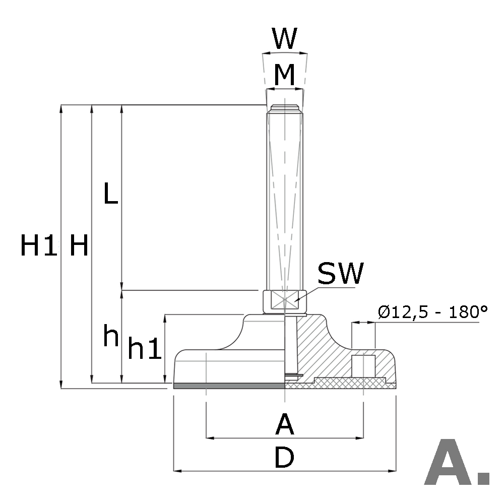 A=Hauteur de construction totale , D=Ø-pied, D=Distance trous de fixation entraxe, H=Longueur du filetage, h=Hauteur, K=Charge statique maximale en kg, M=Filetage, SW=Sur plat, W=Angle en °