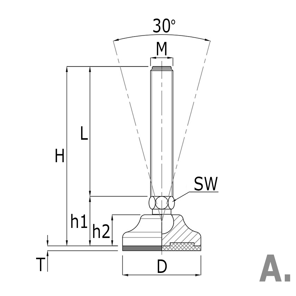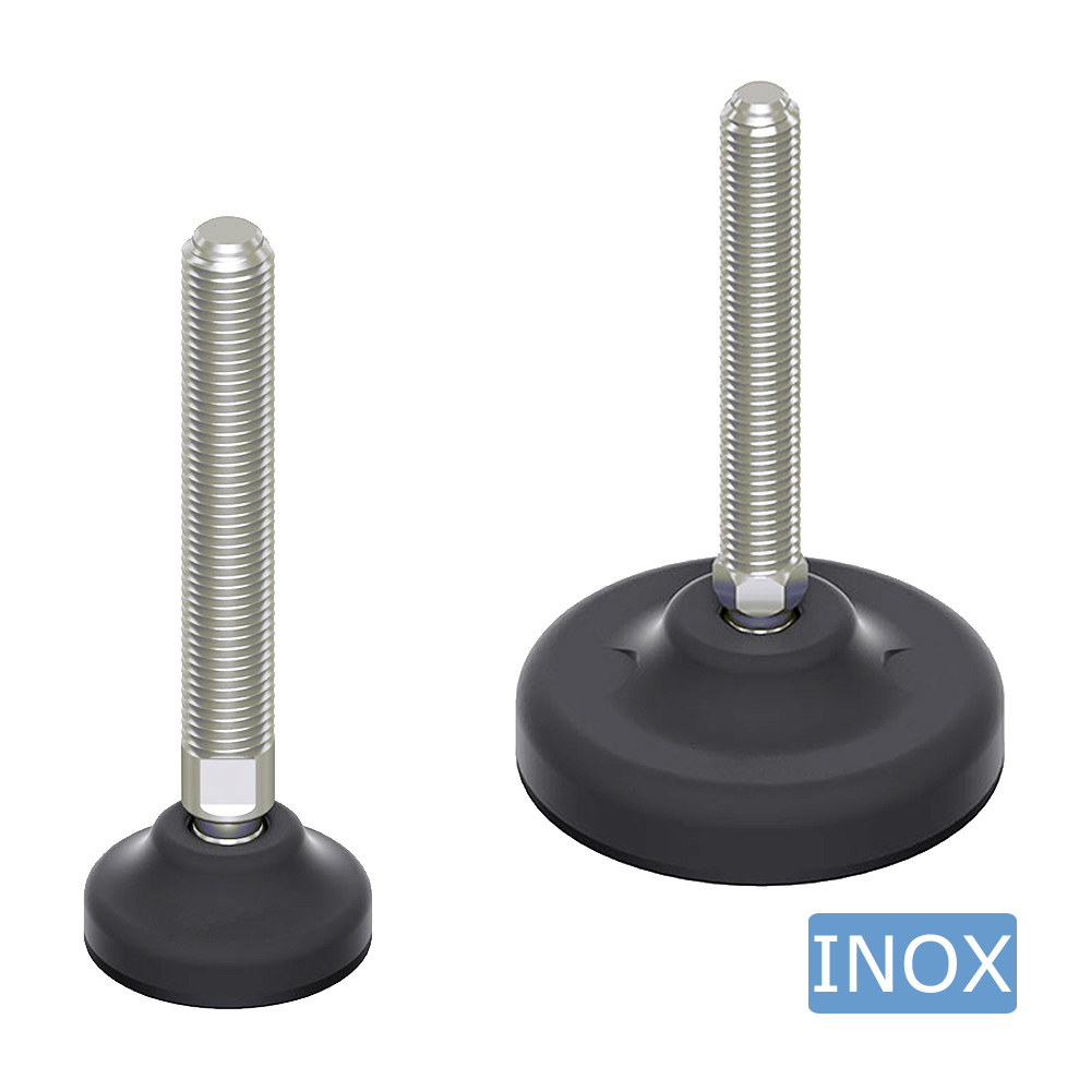 - Les pieds réglables robustes avec base plastique pivotante à rotule sont disponibles avec des tiges filetées en INOX de M6 à M24 avec des longueurs de filetage de 47 mm à 209 mm