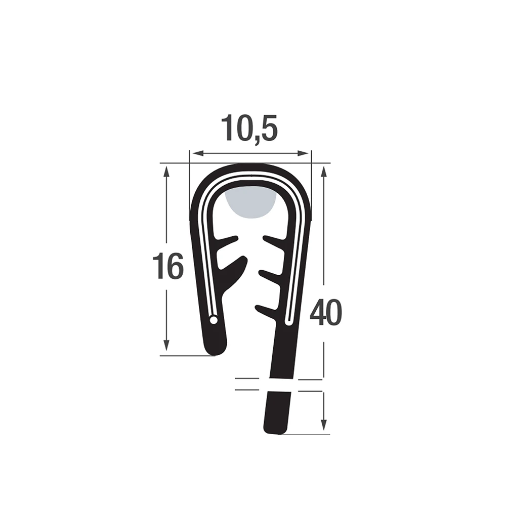 Joint U bord de tôle autoclippant 16/40x10.5mm - PVC armature en acier - accrochage 3-5mmdrawing_1