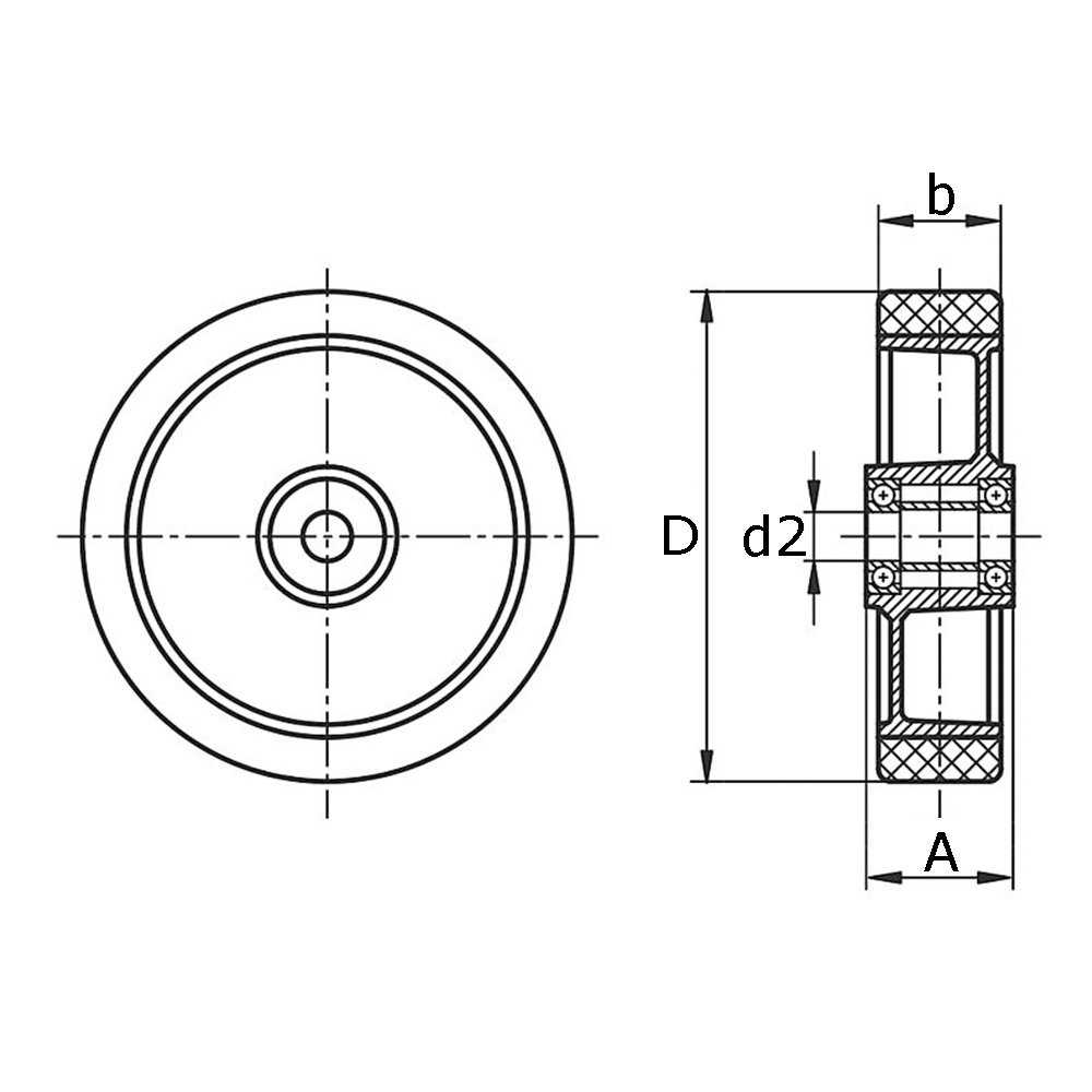 A=Largeur du moyeu, B=Largeur bande de roulement, D=Ø-roue, D2=Ø-alésage, K=Capacité de charge statique max. en kg à 4 km/h, Type=Type de roulement