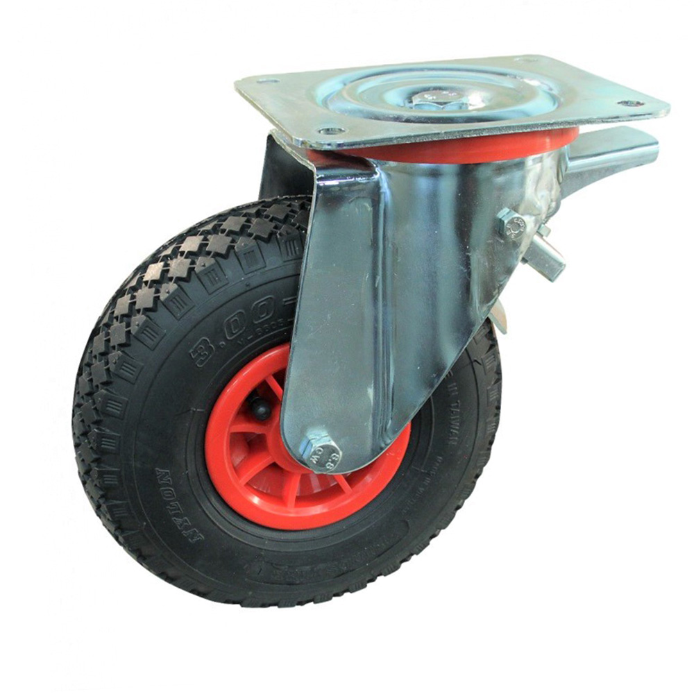 - Les roues pivotantes avec frein et pneu montées sur une jante en plastique rouge sont disponibles avec des pneus de dimension 3.00x4 avec Ply-Rating 2