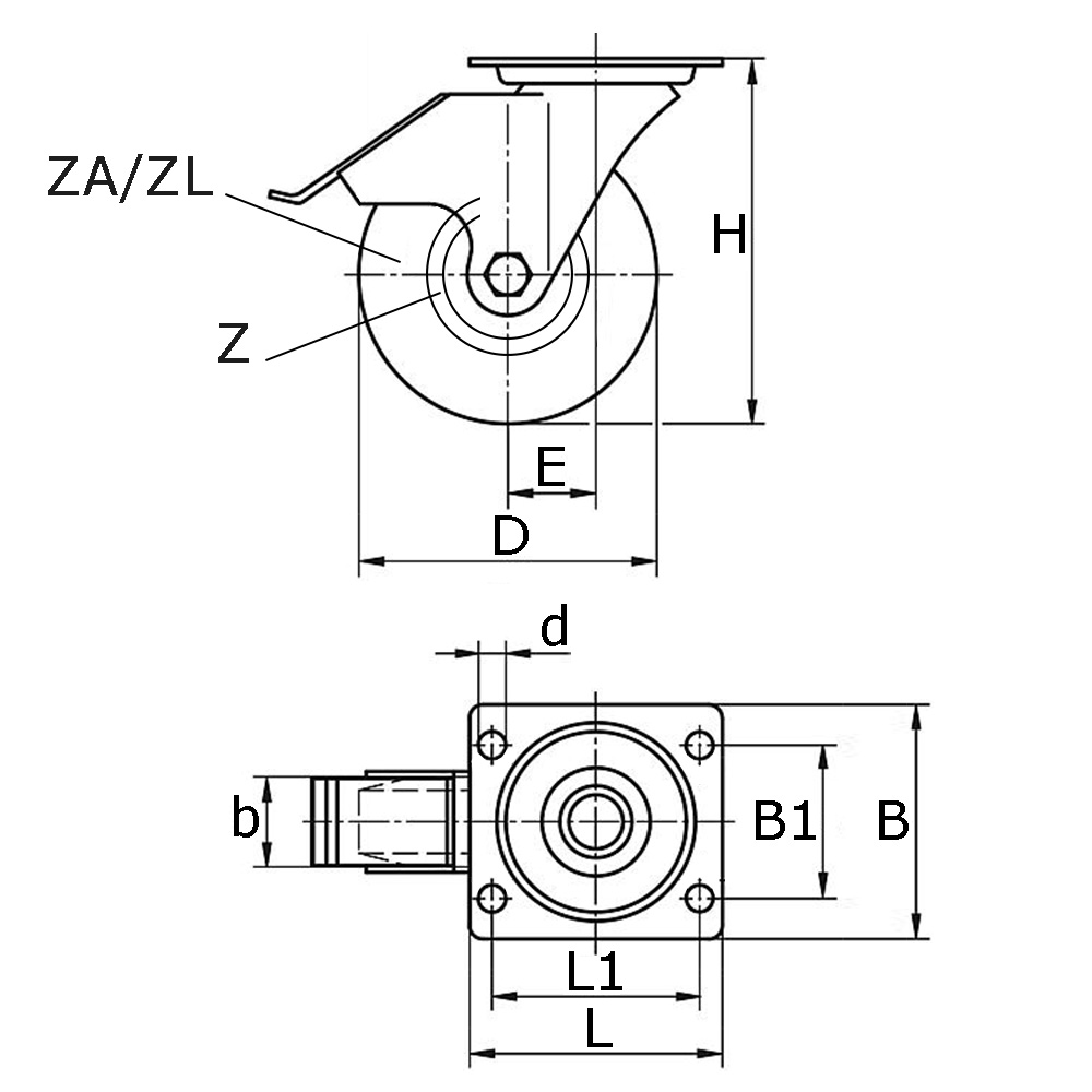 B=Largeur plaque de montage, b=Largeur de pneu en mm, B1=Entraxe perçage, D=Ø-roue intérieur mm, d=Ø-perçage, E=Longueur de la course, H=Hauteur de construction, K=Capacité de charge statique max. en kg à 6 km/h, L=Longeur plaque de montage, L1=Entraxe perçage, T=Classification PLY, Type=Type roulement de roue, Z=Dimension de jante (Ø x largeur), ZA=Dimension de pneu en pouce