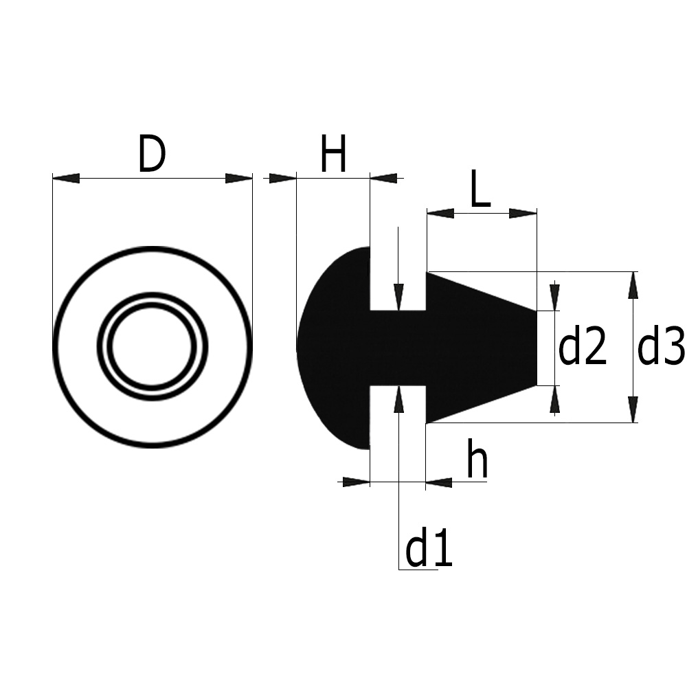 D=Diamètre pied, d1=Ø goupille, d2=Ø goupille, d3=Ø goupille, h=Dimension rainure et dimension épaisseur plaque, L=Longueur goupille de pression, L1=Épaisseur pied, Mat.=Matériau, Var.=Modèle
