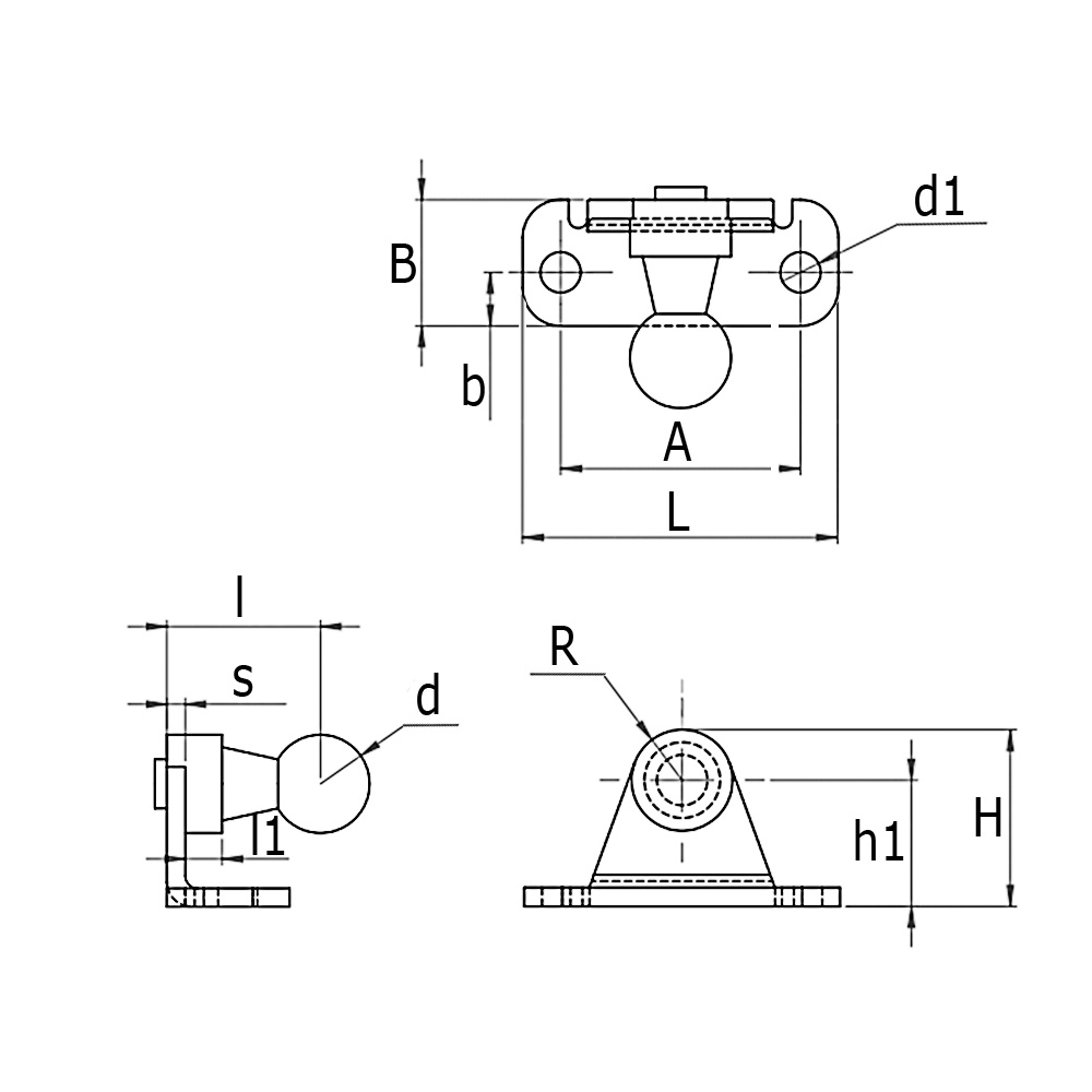 Ressort à gaz équerre de fixation avec joint à rotule Acier galvanisé 50x20x26mm - 2 perçages Ø4.3mm - 40mm entraxe - joint Ø13 - max. 1200N