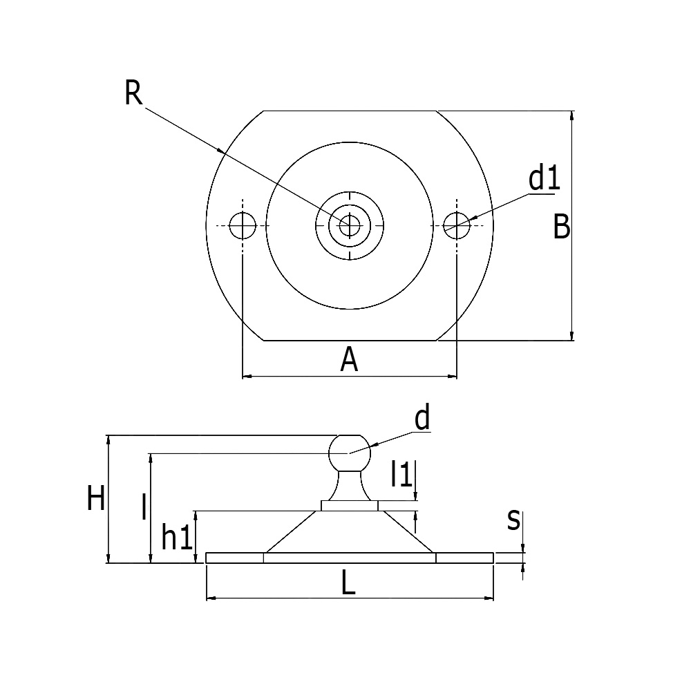 Ressort à gaz plaque de montage Acier galvanisé 55x44mm - joint à rotule Ø10mm - 2 perçages Ø5.0mm - 41mm entraxe - M8 - max. 650N